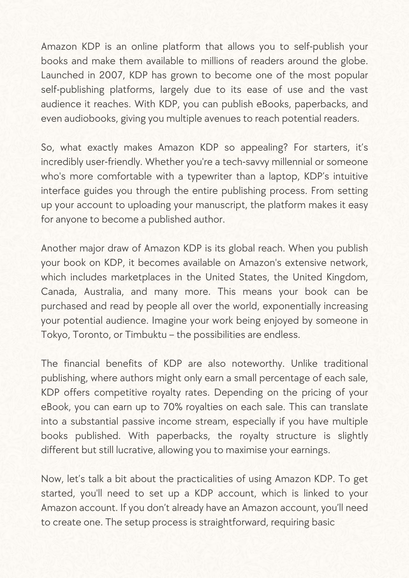 Amazon KDP allows you to self-publish eBooks and paperbacks for free, and reach millions of readers worldwide. This guide will walk you through the entire process—from brainstorming book ideas and formatting, to creating stunning covers and optimizing your book for Amazon's marketplace. Whether you're interested in fiction, non-fiction, low-content books like journals, or even workbooks, this guide is packed with actionable strategies to help you generate income long after your book is published.